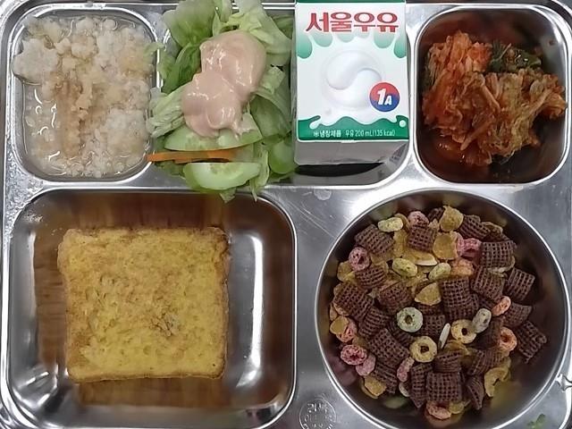조식: 숭늉, 배추김치, 프렌치토스트, 야채샐러드, 시리얼+우유