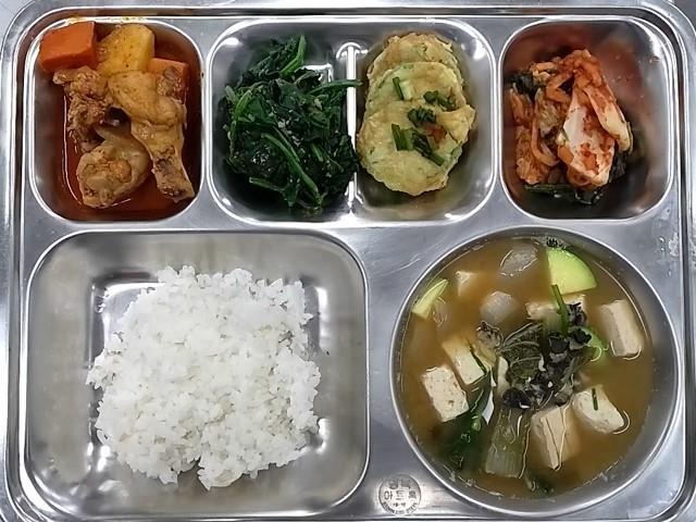 중식: 현미찹쌀밥, 우렁된장국, 닭볶음탕, 시금치들깨무침, 애호박전, 배추김치