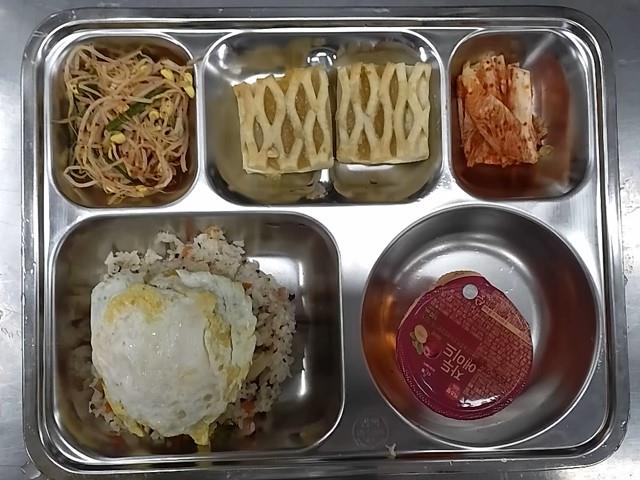 석식: 소고기햄브로콜리볶음밥, 계란후라이, 매콤콩나물무침, 배추김치, 사과파이, 학교로간자두