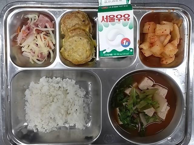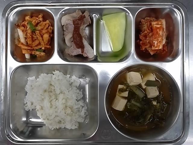 조식: 쌀밥, 오징어무국, 감자채베이컨볶음, 고추해물완자, 깍두기, 우유