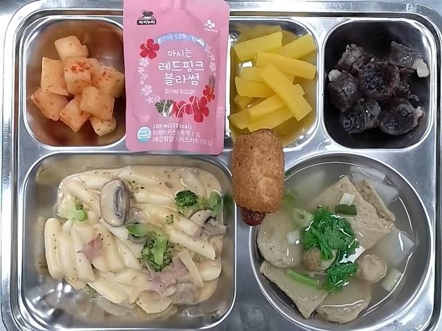 석식: 모둠어묵국, 로제떡볶이, 깍두기, 스틱단무지, 레드핑크블라썸, 롤링핫도그, 찰순대