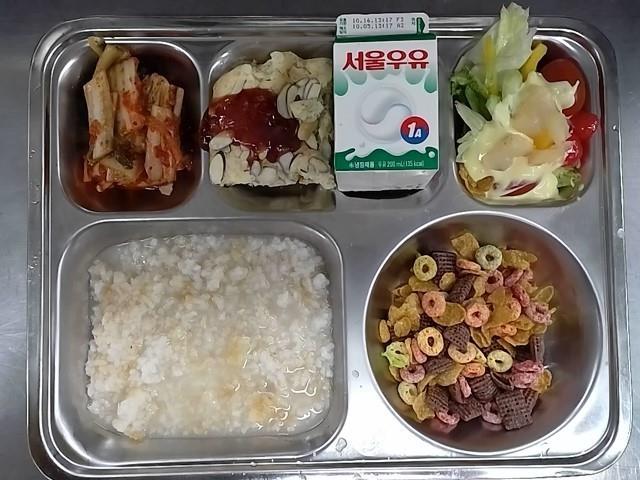 조식: 숭늉, 배추김치, 견과류핫케익, 딸기잼, 시리얼+우유