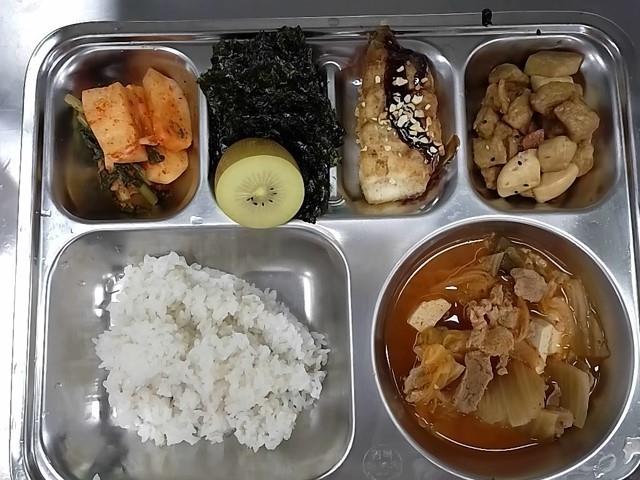 중식: 발아현미밥, 돈육김치찌개, 가자미데리야끼소스구이, 새송이어묵조림, 구운김(자율), 총각김치, 골드키위
