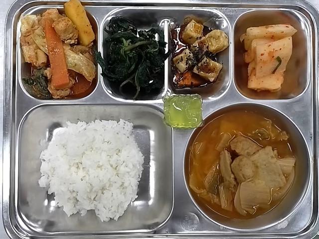 석식: 쌀밥, 김치어묵국, 깻잎순무침, 달갈비, 두부엿장구이, 석박지, 청포도푸딩