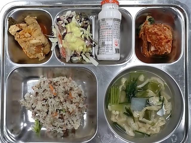 석식: 소고기햄브로콜리볶음밥, 유부어묵국, 맥시칸샐러드, 두부구이양념조림, 배추김치, 요구크르(사과당근)