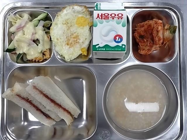 조식: 숭늉, 배추김치, 계란후라이, 토스트+잼, 푸실리샐러드, 우유