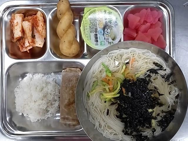 중식: 잔치국수, 메밀김치전병, 배추김치, 반달단무지, 흑임자찹쌀꽈배기, 유기농우리쌀로만든식혜