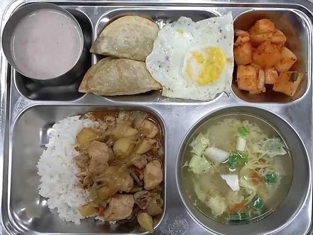 중식: 안동찜닭덮밥, 탕파국, 계란후라이, 버섯군만두, 깍두기, 유자바나나스무디