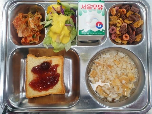 조식: 숭늉, 배추김치, 양상추샐러드, ㅅ리얼+우유, 토스트+잼