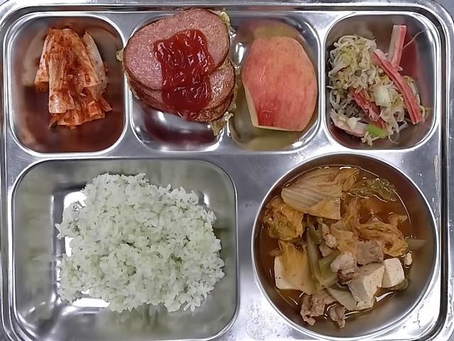 석식: 클로렐라밥, 돈육김치찌개, 숙주맛살무침, 배추김치, 아오리사과