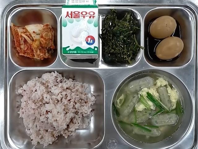 조식: 차수수밥, 꼬물이 만두계란탕, 계란장조림, 비름나물고추장무침, 배추김치, 우유