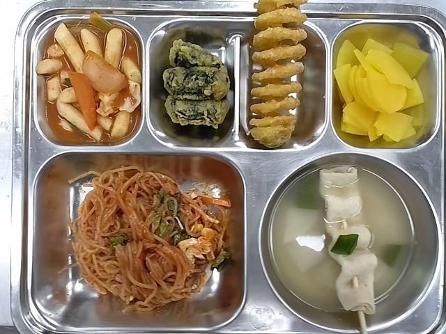 중식: 꼬치어묵국, 쫄면채소무침, 김말이/떡볶이, 회오리감자, 저염단무지