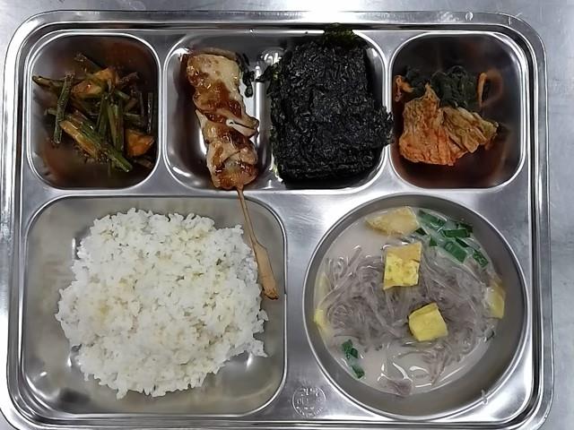 석식: 기장밥, 설렁탕/당면사리, 오이부추무침, 구운김, 배추김치, 양념닭꼬치