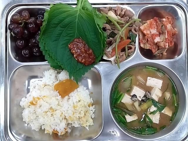 중식: 단호박밥, 우렁된장국, 오리불고기(매콤), 배추김치, 친환경 상추깻잎/쌈장, 포도