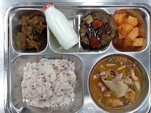 석식: 차수수밥, 얼큰낙지수제비국, 오이랑무랑장아찌, 깍두기, 장액티브요구르트, 수제떡갈비