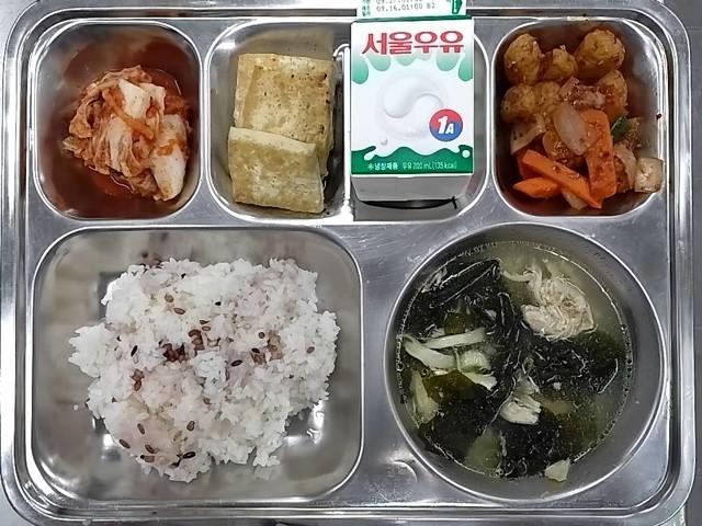 조식: 혼합잡곡밥, 닭미역국, 매콤볼어묵볶음, 두부구이/간장소스, 배추김치, 우유