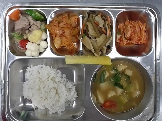 중식: 쌀밥, 감자호박된장국, 돈육사태떡찜, 노각생채, 우엉채어묵볶음, 배추김치, 파인애플바