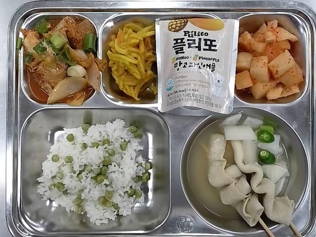 석식: 완두콩밥,, 꼬치어묵국, 고등어김치조림, 감자채카레볶음, 깍두기, 망고파인애플음료