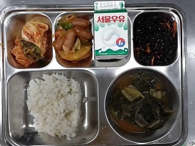 조식: 현미찹쌀밥, 근대된장국, 비엔나파인애플조림, 고구마줄기볶음, 배추김치, 우유