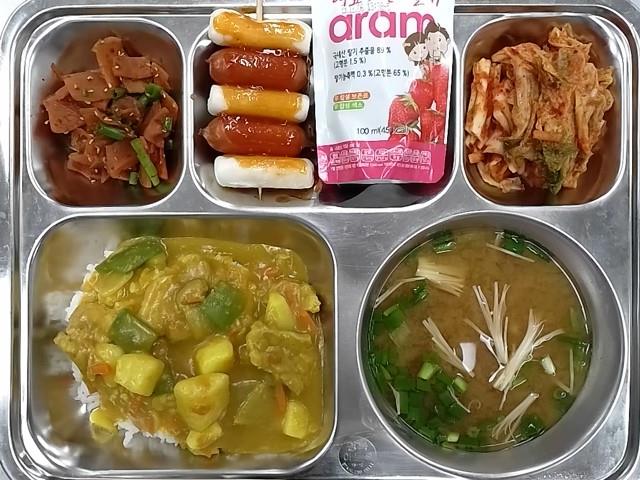 석식: 목살카레라이스, 팽이된장국, 오복채무침, 배추김치, 소떡소떡, 딸기주스