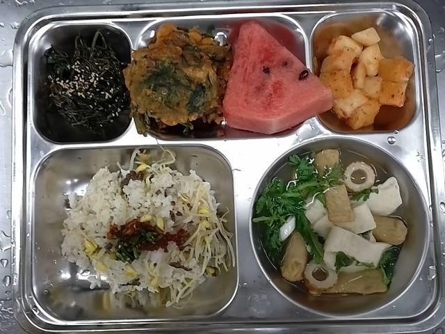 중식: 한우콩나물밥/양념장, 쑥갓어묵국, 고춧잎고추장나물, 부추장떡, 깍두기