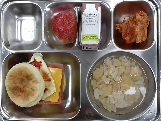 조식: 배추김치, 숭늉, 모닝샌드위치, 사과, 밀크코코아