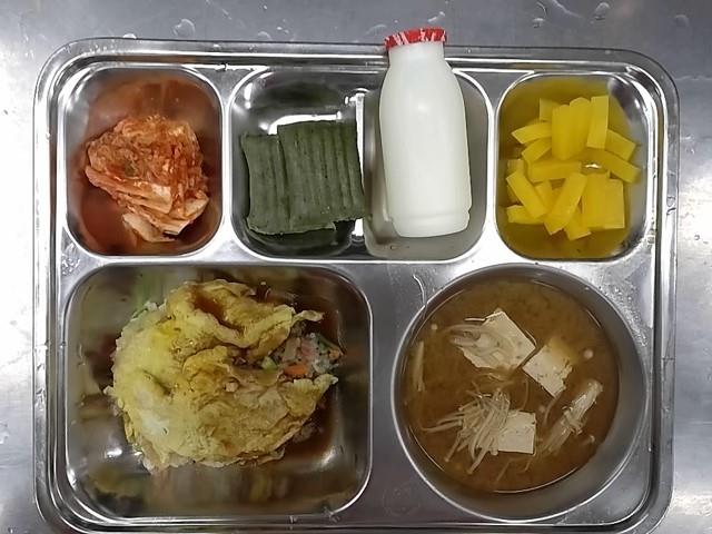 조식: 오므라이스, 팽이두부된장국, 배추김치, 스틱단무지, 장액티브요구르트, 우리쌀단호박앙금절편