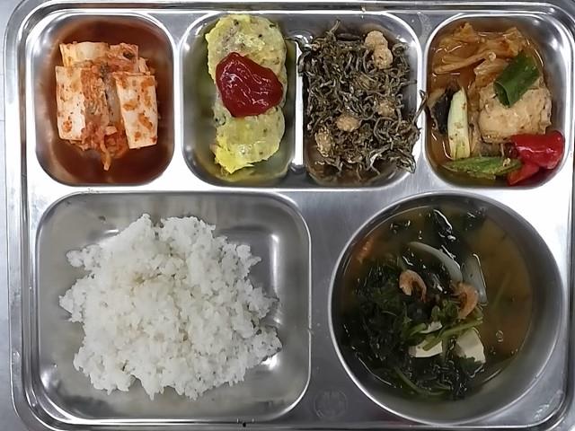 중식: 쌀밥, 건새우아욱된장국, 멸치찹쌀콩조림, 고등어김치조림, 부추해물완자, 배추김치
