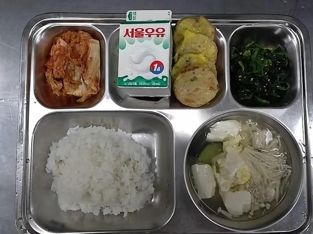 조식:쌀밥, 순두부계란국, 시금치무침, 고추해물완자, 배추김치, 우유