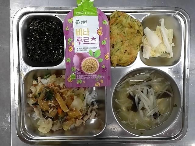 중식: 오징어덮밥, 다시마무채국, 아몬드파래자반, 애호박전, 백김치, 비타후르츠
