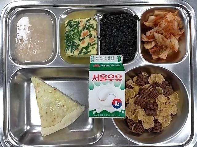 조식: 숭늉, 아채계란찜, 구운김(자율), 배추김치, 고르곤졸라피자, 시리얼+우유