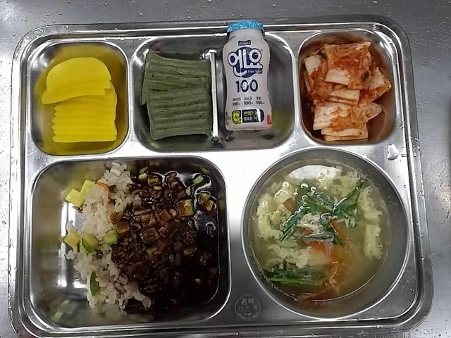 석식: 볶음밥/자장소스, 부추계란국, 배추김치, 스틱단무지, 우리쌀단호박쑥앙금절편, 엔요플레인요구르트