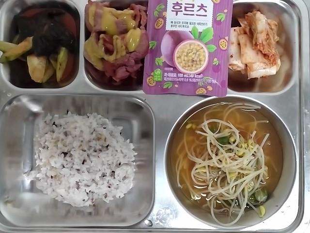 석식: 혼합잡곡밥, 얼큰콩나물국, 미역오이무침, 오리훈제/소스, 비타후르츠, 배추김치
