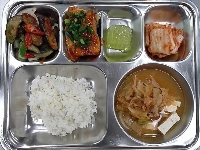 중식: 현미찹쌀밥, 돈육김치찌개, 고등어고추장양념구이, 가지볶음, 배추김치, 샤인머스캣푸딩