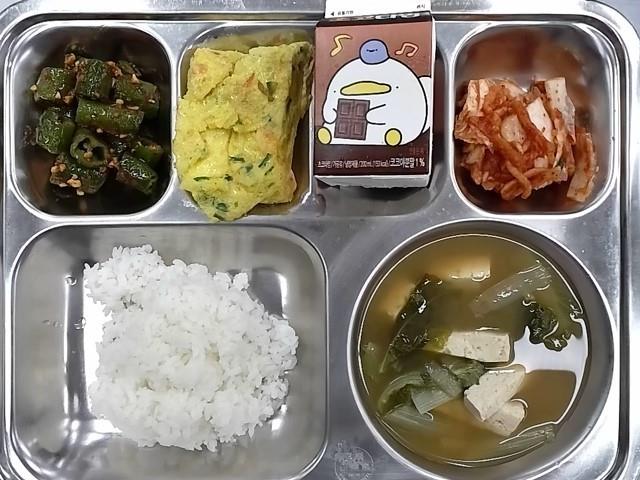조식: 쌀밥, 두부된장국, 아삭이고추된장무침, 치즈계란말이,배추김치, 초코우유