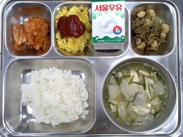 조식: 닭곰탕, 멸치찹쌀콩조림, 햄스크램블에그/케찹, 배추김치, 우유