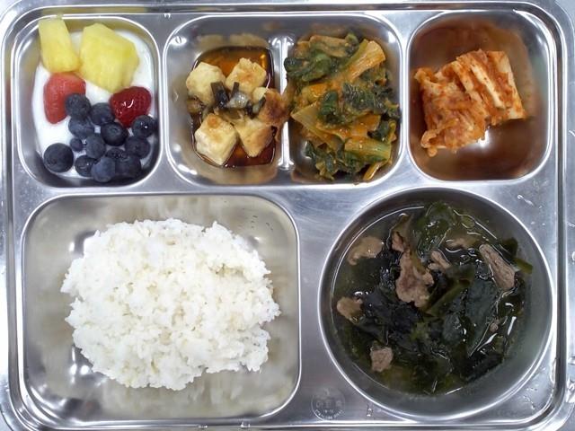 중식: 현미찹쌀밥, 한우미역국, 애배추된장무침, 두부엿장구이, 배추김치, 과일요거트
