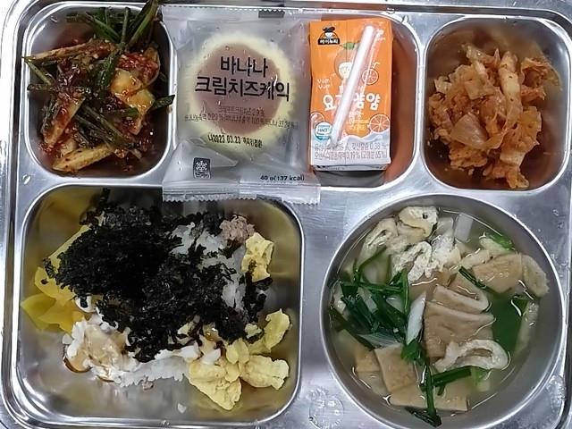 석식: 참치마요덮밥, 유부어묵국, 볶음김치, 요거얌얌, 바나나크림치즈케이크