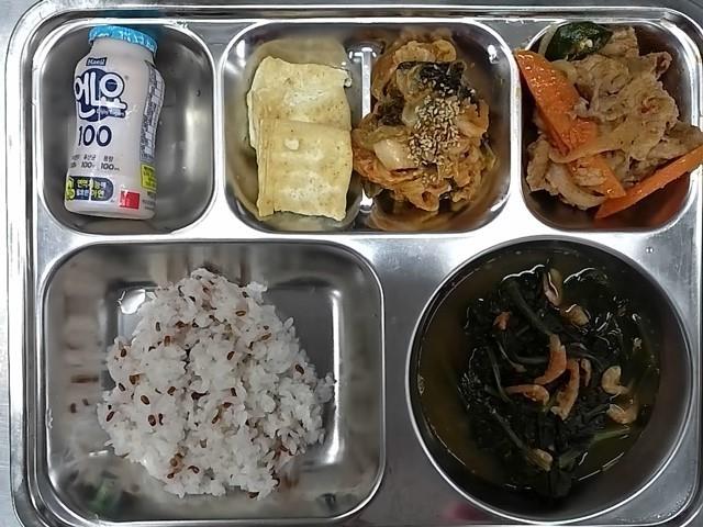 중식: 홍미밥. 건새우시금치된장국, 돈육두루치기, 두부전/볶음김치, 엔요플레인요구르트