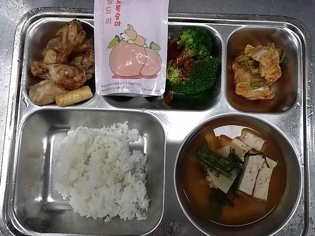 석식: 쌀밥, 오징어무국, 브로콜리/초장, 닭봉오븐구이,배추김치, 천도복숭아주스