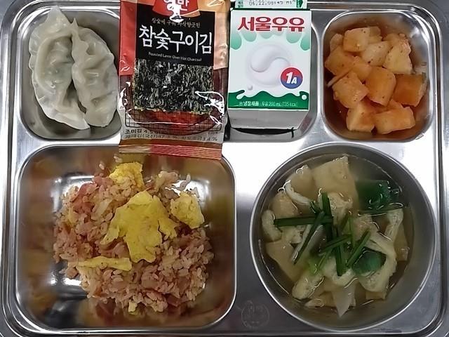 조식: 베이컨김치볶음밥, 유부어묵국, 교자만두찜, 도시락김, 깍두기, 우유