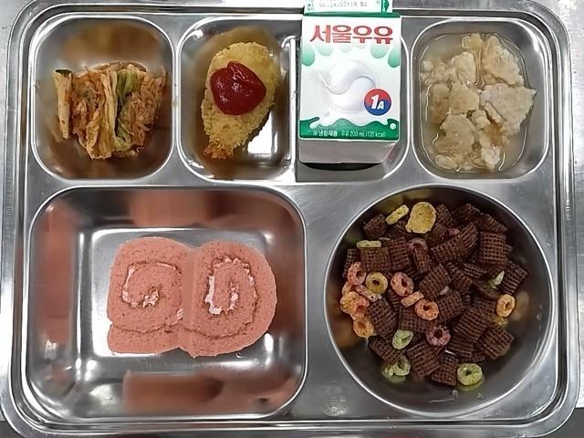 조식: 누룽지, 화이트롤케이크, 시리얼+우유, 새우튀김, 배추김치