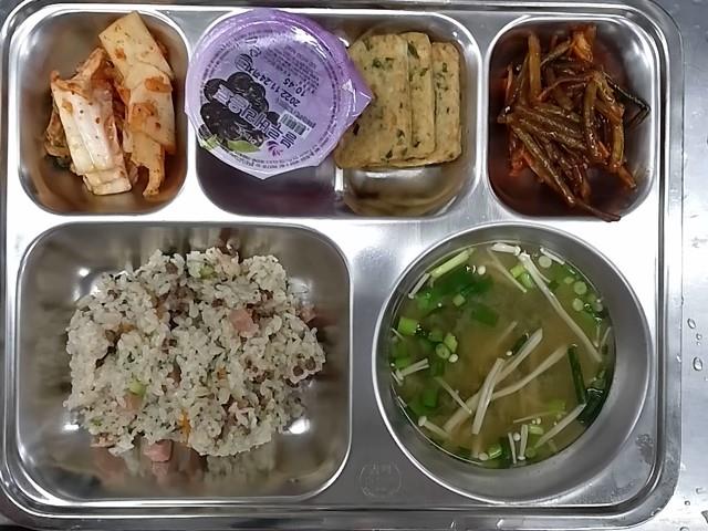 석식: 소고기햄브로콜리볶음밥, 팽이된장국, 우리떡명태살두부전, 마늘쫑장아찌, 배추김치, 블루베리주스