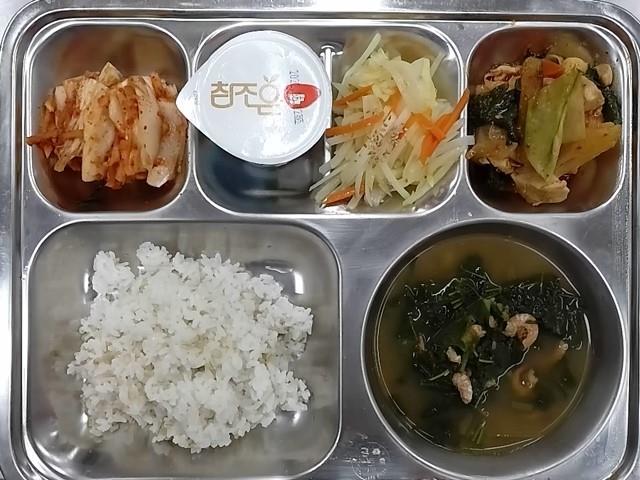 중식: 찰보리밥, 아욱된장국, 닭갈비, 감자채볶음, 배추김치, 프라임아이스크림