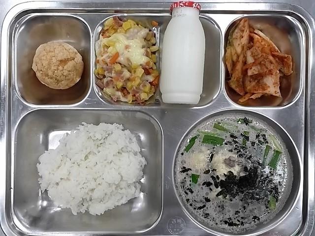조식: 쌀밥, 사골떡국, 콘치즈버터구이, 배추김치, 비스켓슈, 장액티브요구르트