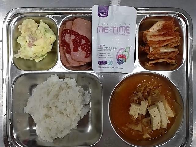석식: 현미찹쌀밥, 돈육김치찌개, 감자샐러드, 스팸구이/케찹, 배추김치, 미타임프룬주스