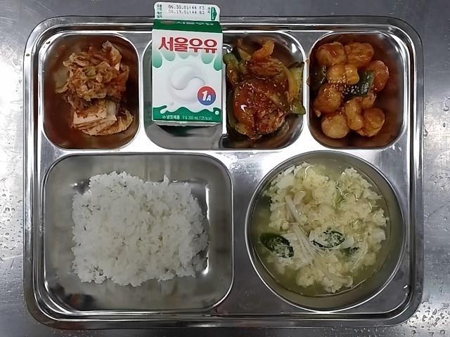 조식: 쌀밥, 순두부계란국, 미트볼조랭이떡조림, 도라지오이무침, 배추김치, 우유