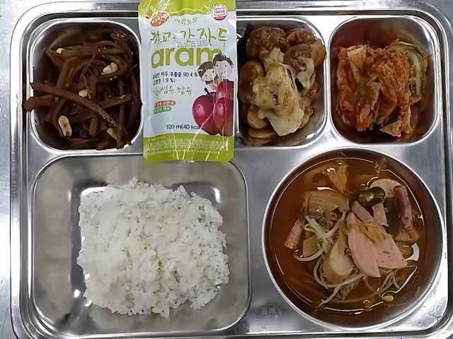 석식: 현미찹쌀밥, 부대찌개, 우엉땅콩조림, 떡갈비볼, 배추김치, 학교로간자두