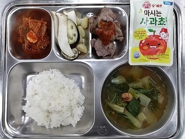 중식: 쌀밥, 애배추된장국, 목살구이/마늘/쌈장, 보쌈김치, 마시는사과쵸
