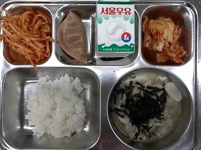 조식: 쌀밥, 떡만두국, 배추김치, 무생채, 우유, 수수부꾸미